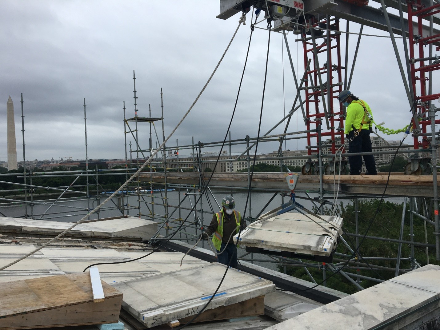 Using a combination of gantry systems, chainfalls, and crane operations, Atlantic carefully removed and cataloged each of the 315 marble roof stones -some measuring over six feet in length - before resetting them to their exact original positions. The team completed full-scale condition surveys, documentation, and shop drawings, ensuring precise restoration sequencing and alignment.